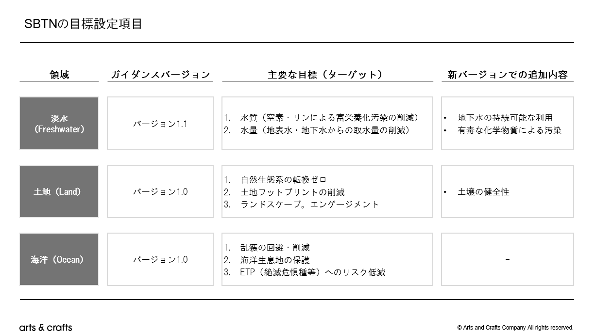 従来は気候変動への対応を中心に科学的根拠に基づく目標設定が求められ、SBTi(Science Based Targets initiative)がその役割を担ってきました。しかしSBTiは、企業の削減目標の対象領域・算定基準・検証フレームワークが温室効果ガス(GHG)に限定されているため、森林・水・生物多様性などを含む自然資本全体を包括的に扱うには限界があります。