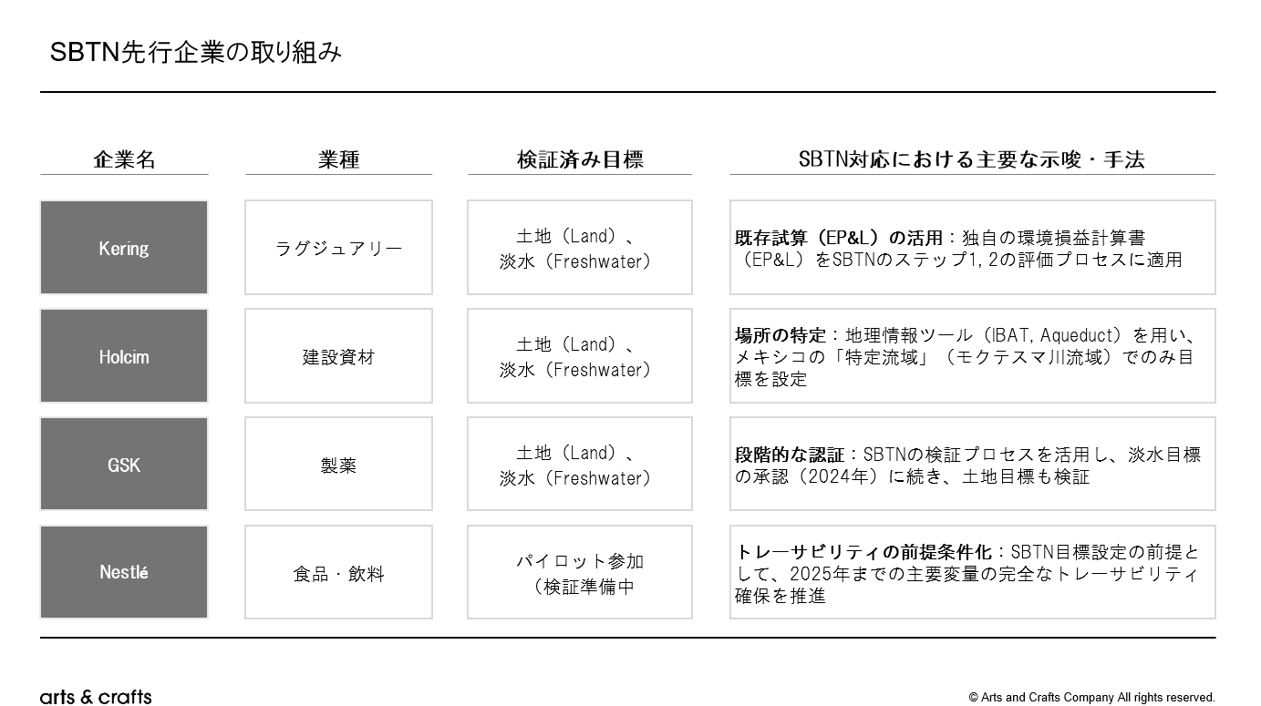 SBTNが本格的な国際枠組みとして定着しつつあるなかで、企業に求められるのは「環境対応の深化」に留まりません。重要なのは、自然資本を経営資源の一部として捉え、気候・社会・経済を横断的に統合する戦略的対応へと発展させることです。先行する企業群(Kering, Holcim, GSK, Nestlé)の事例は、そのための具体的な戦略を示しています。