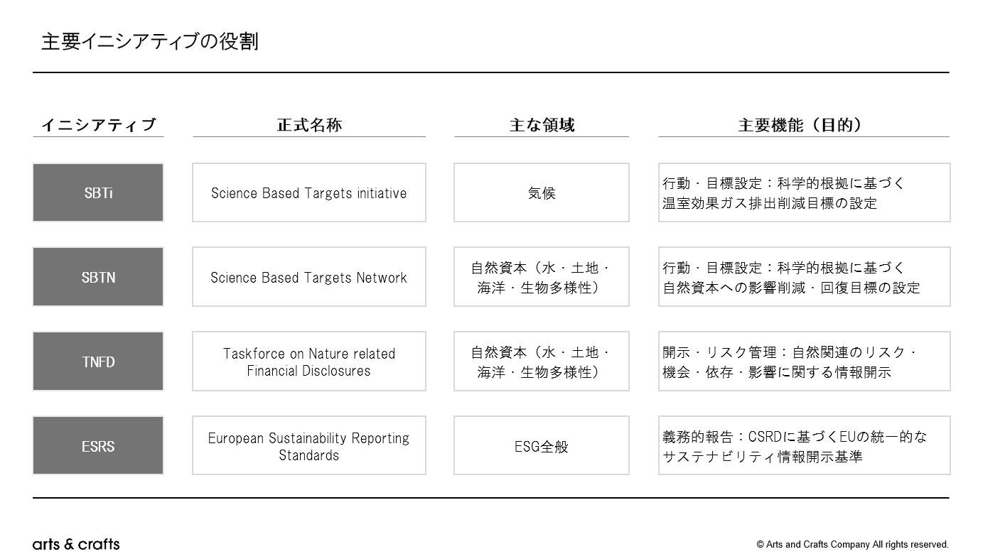従来は気候変動への対応を中心に科学的根拠に基づく目標設定が求められ、SBTi(Science Based Targets initiative)がその役割を担ってきました。しかしSBTiは、企業の削減目標の対象領域・算定基準・検証フレームワークが温室効果ガス(GHG)に限定されているため、森林・水・生物多様性などを含む自然資本全体を包括的に扱うには限界があります。