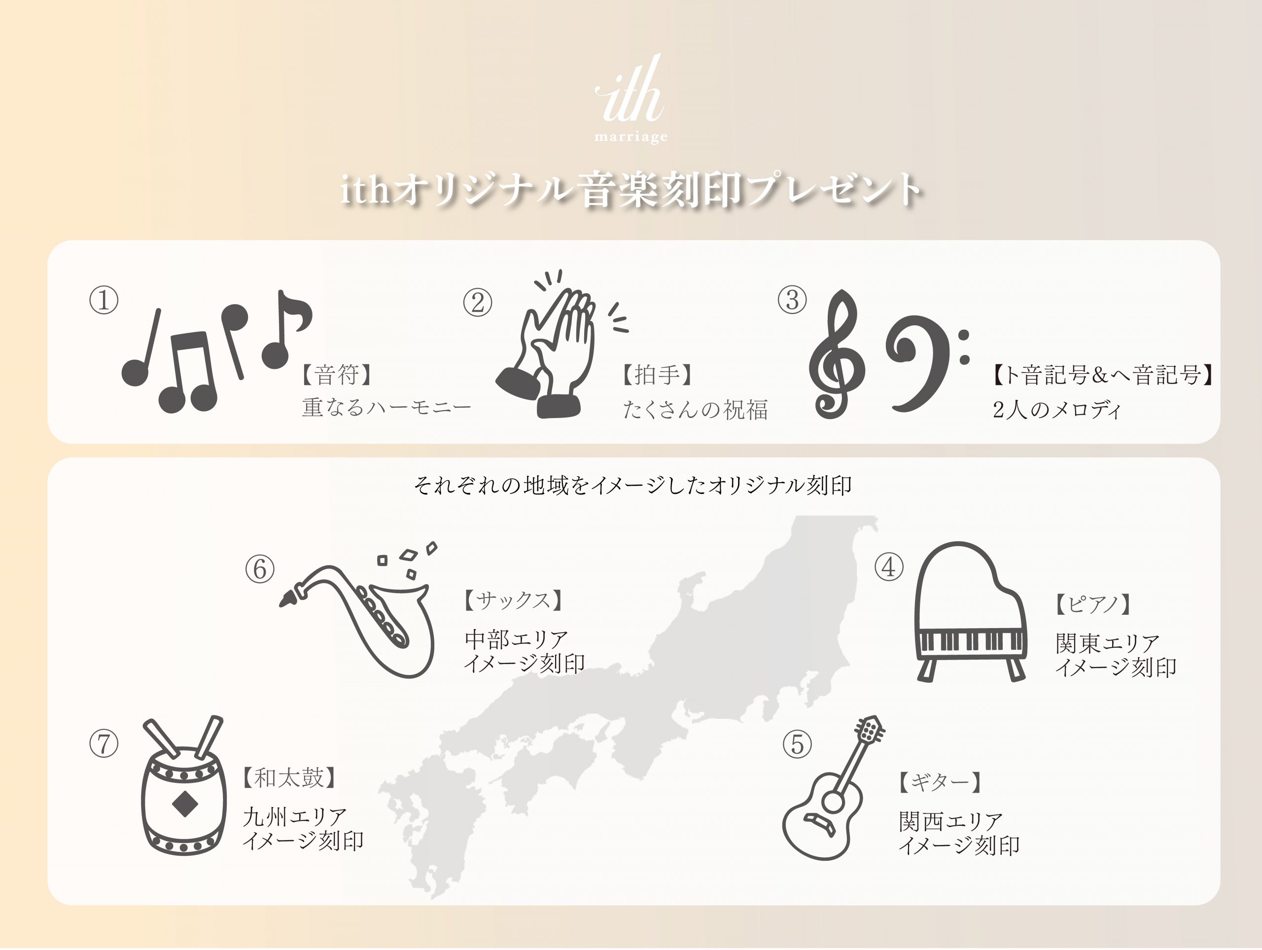 フェア期間中にithの音楽コレクション(全24型)に該当する結婚指輪※をご成約頂いたお客様を対象に、音楽をテーマにしたithオリジナルイラスト刻印(7種)のうち1種を無料でプレゼントします。