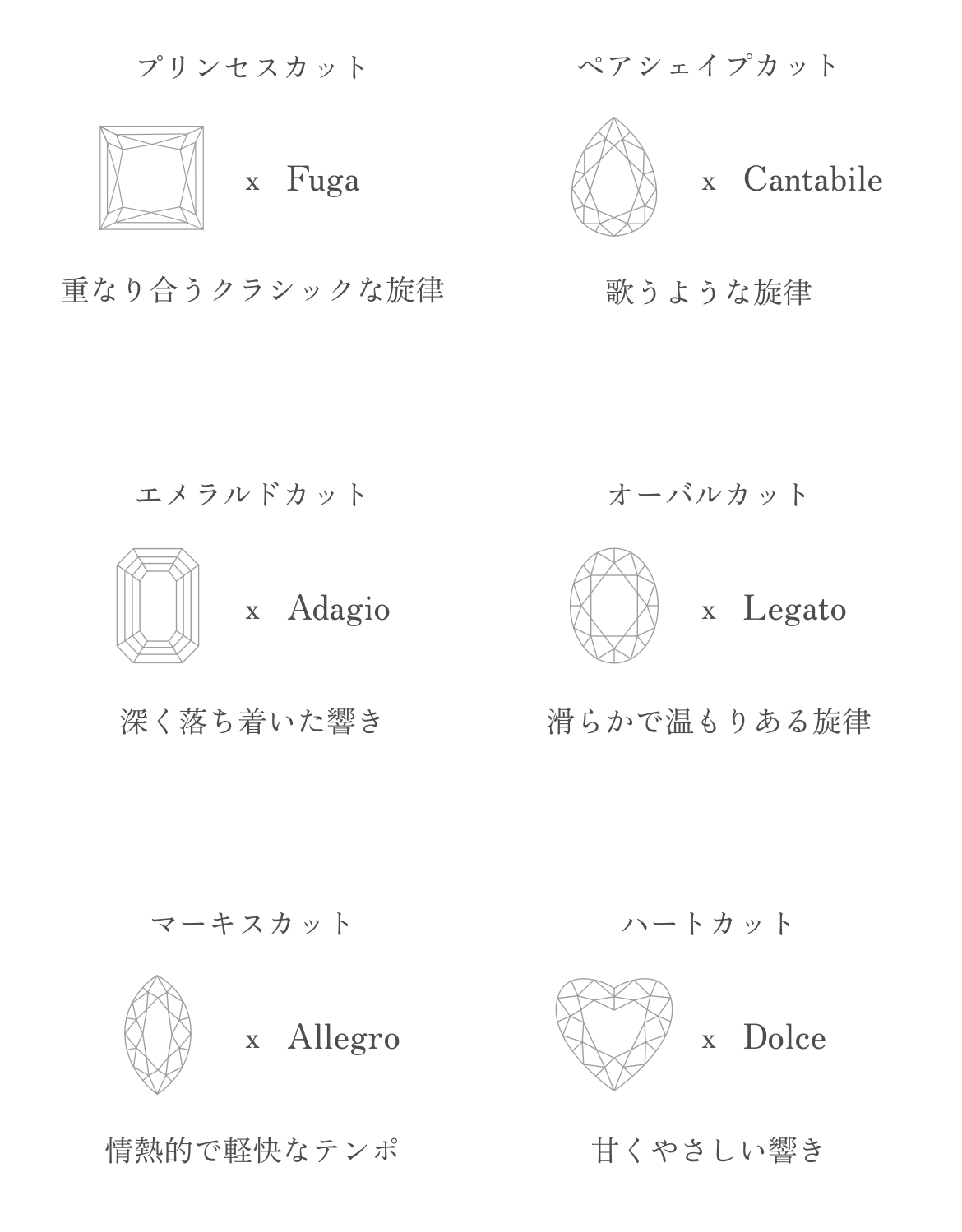ダイヤモンドのカットごとに異なる個性を、音楽の表現になぞらえてご紹介します。