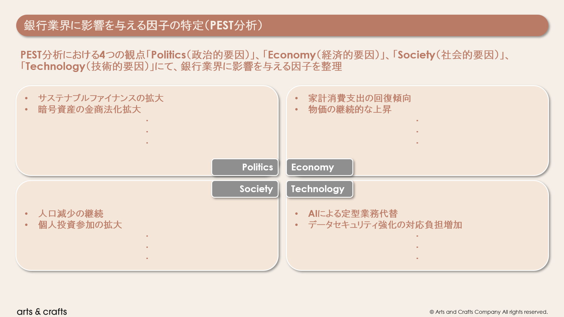 PEST分析は、銀行業界を取り巻く外部環境の因子(トレンド)を整理・分析する手法であり、銀行業界に影響を与える因子を体系的に整理し、戦略判断に活用できる形式に落とし込むことを目的とする。