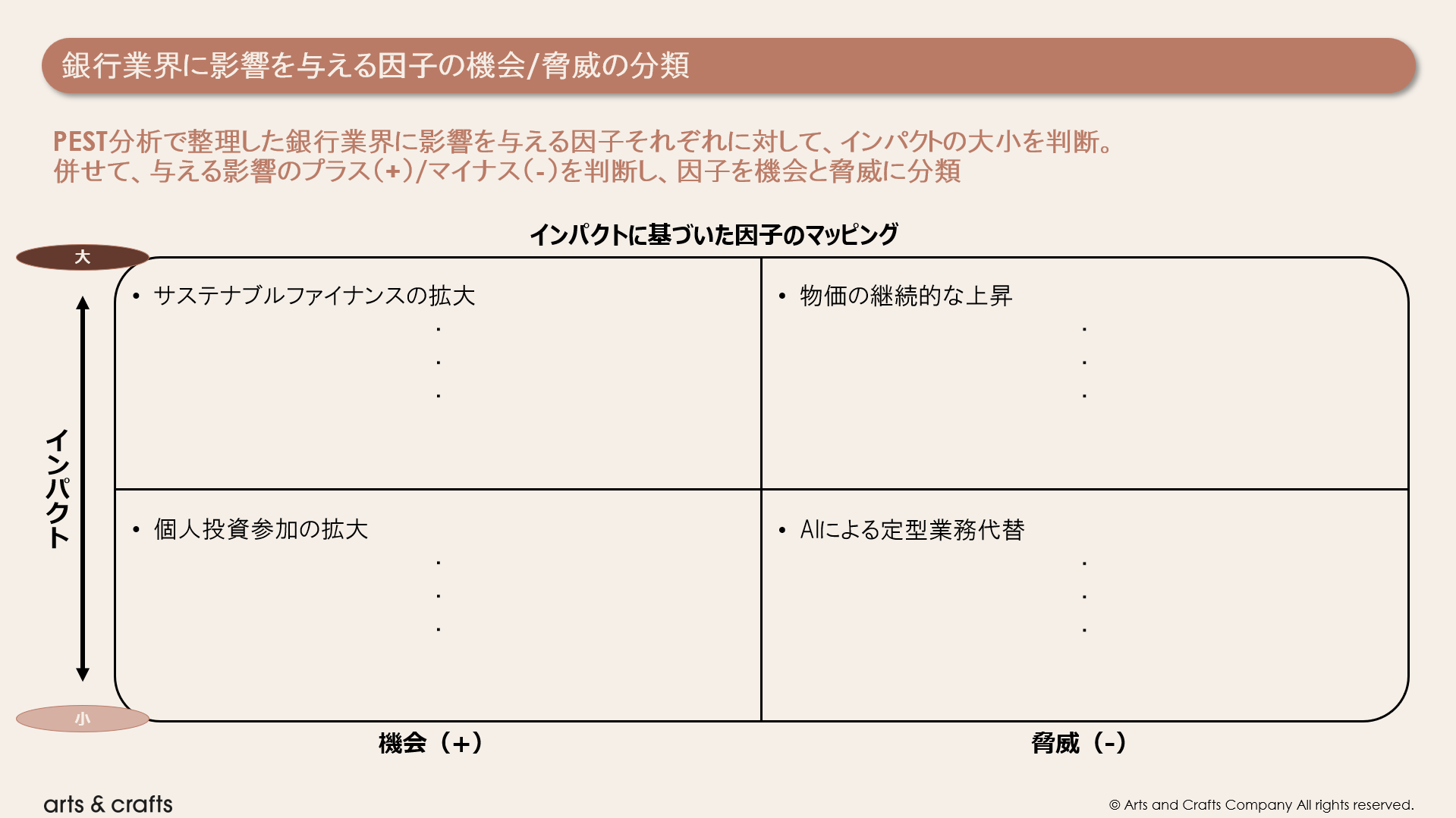 で整理した銀行業界に影響を与える因子各々を以下の観点で機会/脅威に分類する。この結果は、後述のSWOT分析において、外部要因(機会/脅威)として活用する。