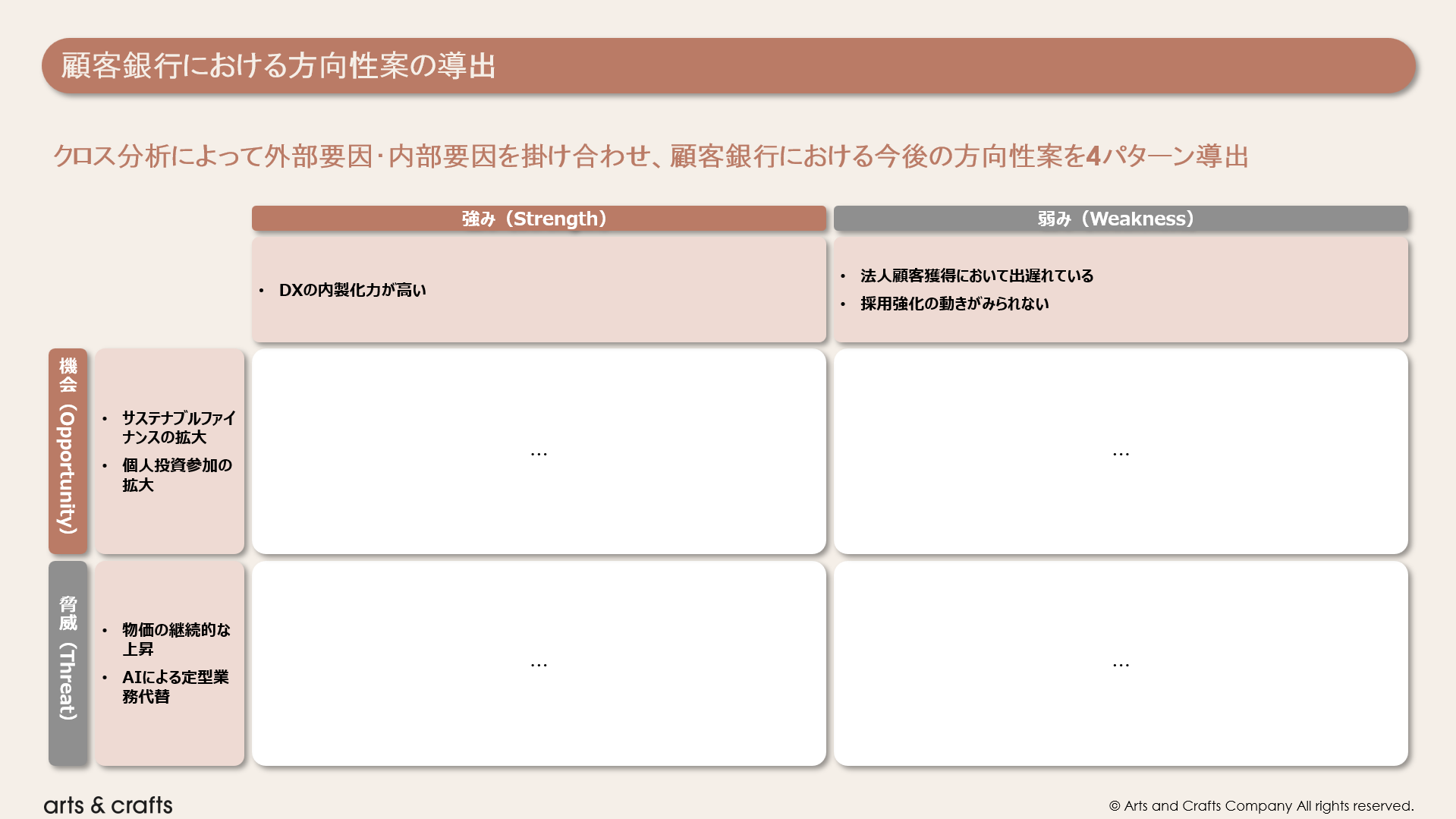 SWOTで整理した外部要因・内部要因を用い、前述のクロス分析を行うことで、顧客銀行が今後行うべき施策の方向性案を導出する。
