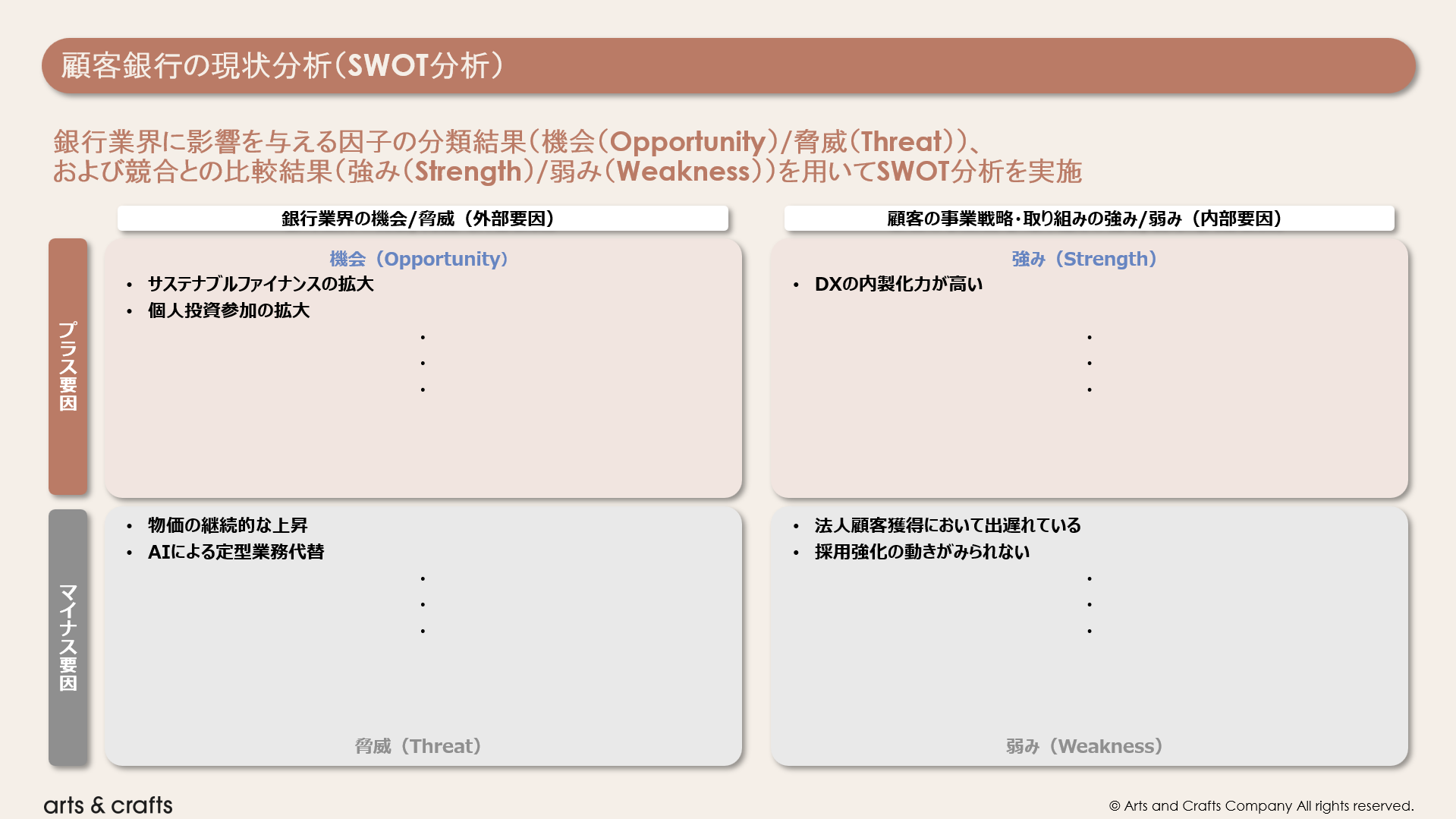 具体的には、ステップ①で特定した「外部要因(銀行業界全体に影響を与える 機会/脅威)」と、ステップ②で特定した「内部要因(顧客銀行の 強み/弱み)」を活用し、SWOT分析を用いて提案内容案を構築する。