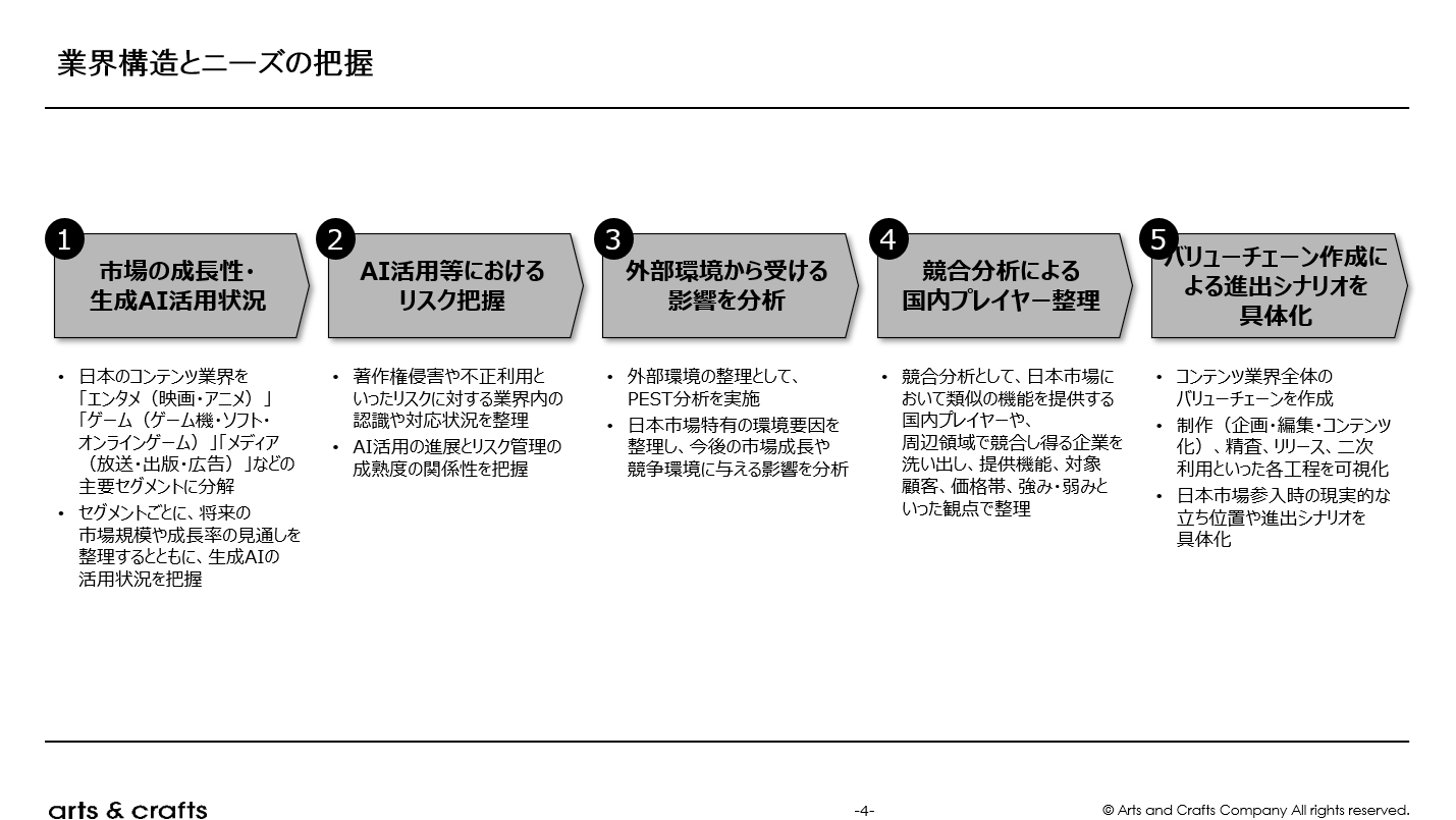 業界構造とニーズの把握の目的は、日本のコンテンツ(エンタメ・メディア)業界を対象に、市場規模や成長性、業界構造を整理したうえで、今後の市場見通しを定量・定性の両面から把握することです。