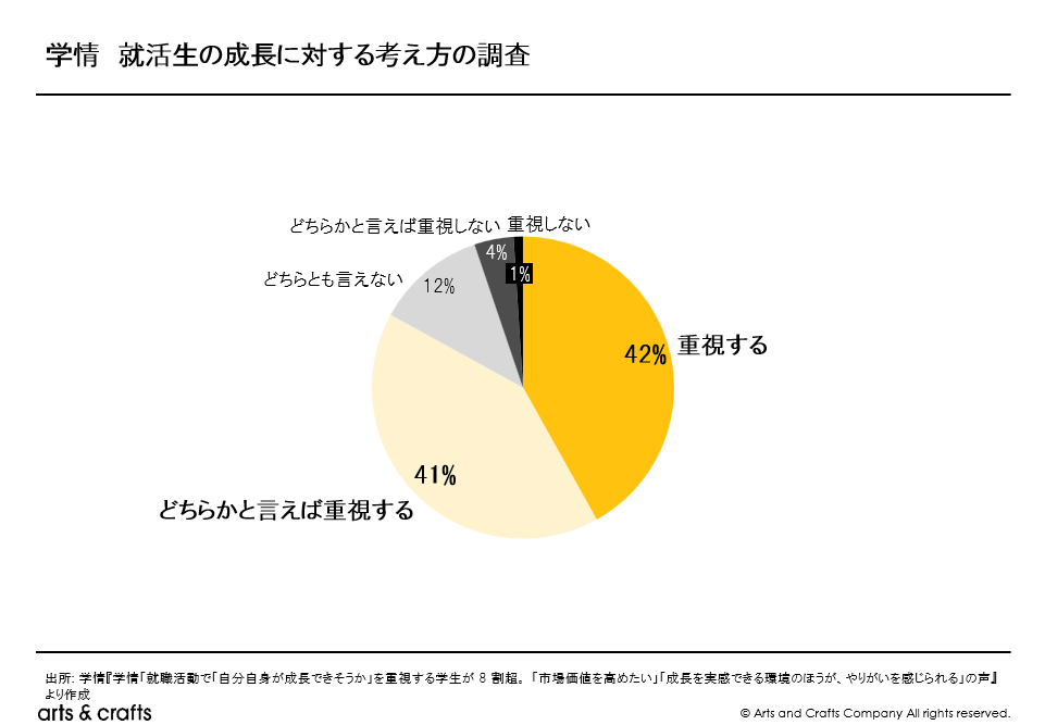 実際、就活生の多くが企業選びにおいて「成長できるかどうか」を重要な判断軸としていることが、調査結果からも明らかになっています。学情による26年3月に大学・大学院を卒業(修了)予定の学生を対象としたアンケートでは、就職活動で「自分自身が成長できそうかを重視する」と回答した学生が 8 割を超えています。